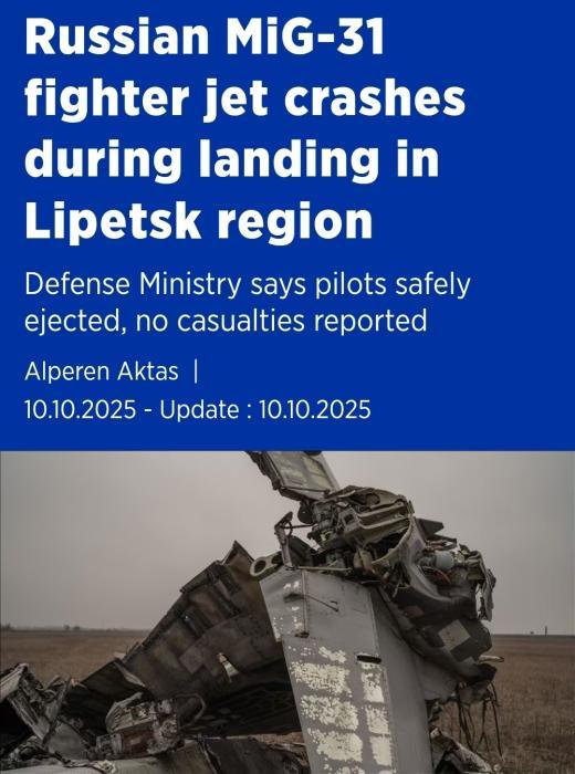 中新網(wǎng)10月10日電 據(jù)土耳其阿納多盧通訊社報(bào)道,俄羅斯國防部9日表示,俄軍一架米格-31戰(zhàn)機(jī)在利佩茨克州墜毀。飛行員彈射逃生,沒有生命危險(xiǎn)。