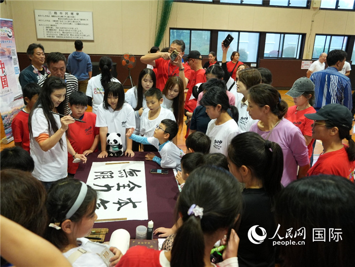 中國書法展示引來眾人圍觀。人民網(wǎng) 許可攝