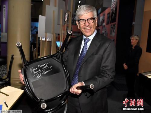 資料圖:2018年諾貝爾經(jīng)濟學(xué)獎獲得者保羅·羅默展示其簽名的椅子。
