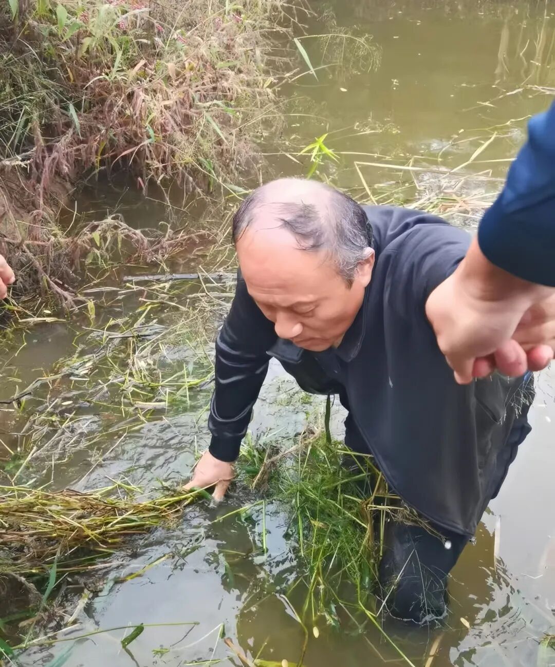 事發(fā)時,新鋪鎮(zhèn)徐山村的退伍軍人文政正在池塘對岸釣魚。聽到急促的“救命”呼喊聲后,他立刻扔掉手中的魚竿,循聲飛奔至岸邊。只見冰冷刺骨的池水中,一位老人正在拼命掙扎,情況萬分危急。文政來不及多想,為了盡快趕到老人身邊,他毅然選擇從池塘里的蘆葦蕩中穿梭過去,一邊奮力開路,一邊大聲呼喊詢問老人的位置。