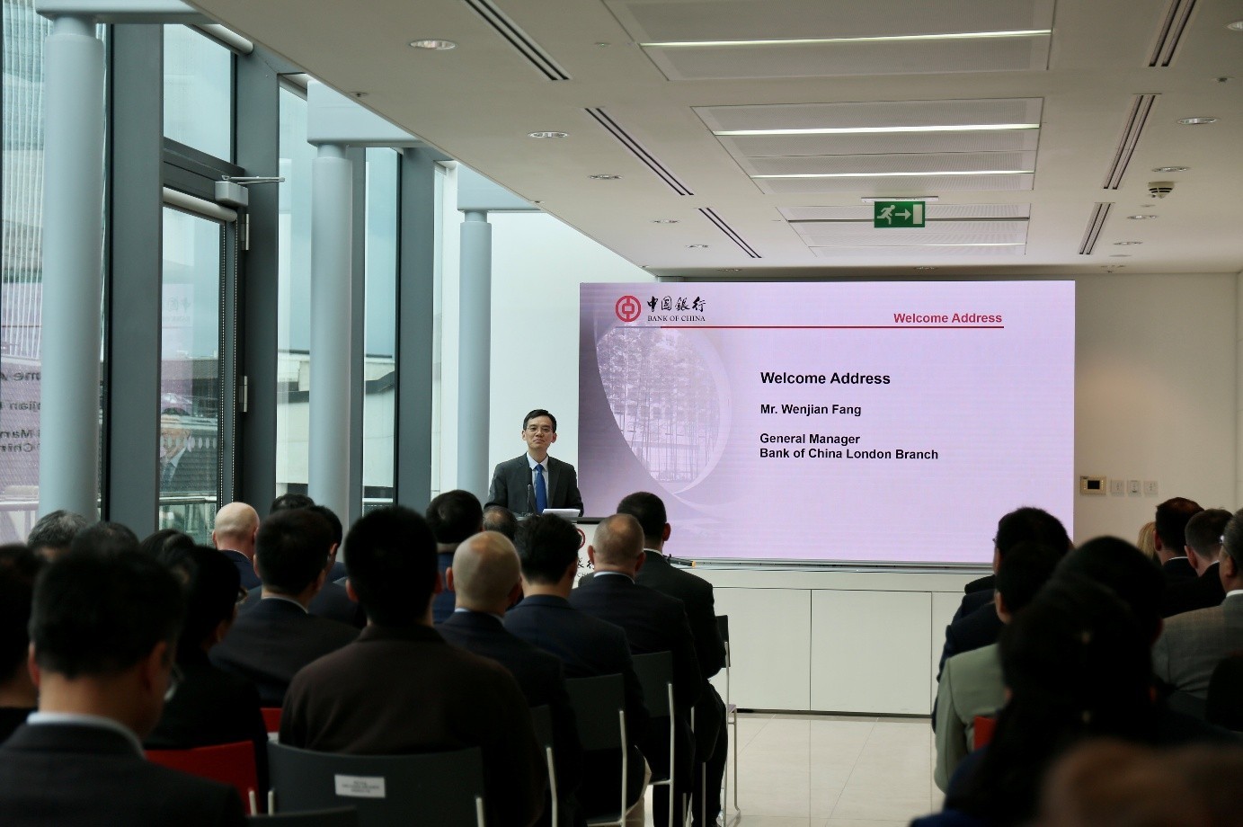 中國(guó)銀行倫敦分行行長(zhǎng)方文建致歡迎辭。主辦方供圖