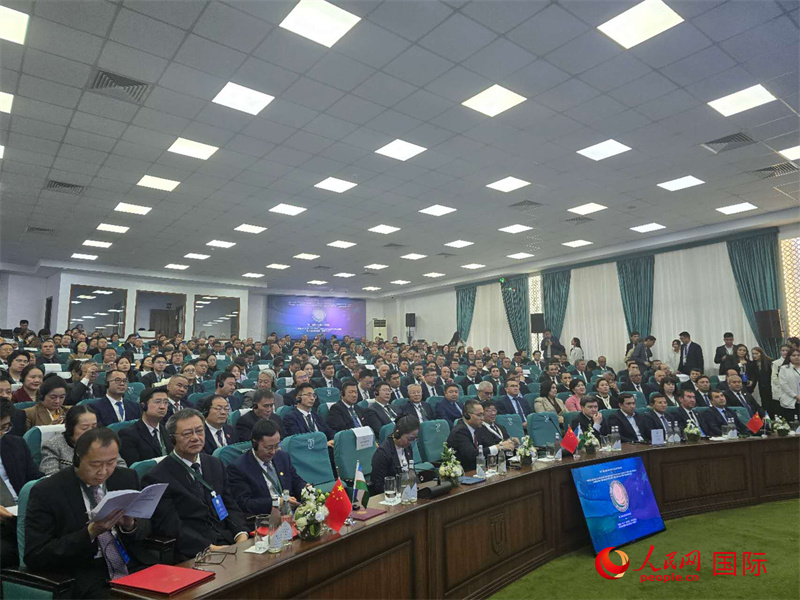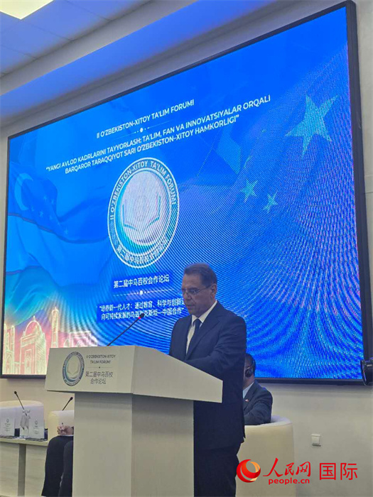 烏茲別克斯坦高等教育、科學(xué)與創(chuàng)新部部長孔格拉特拜·沙里波夫致辭。人民網(wǎng)記者 李強攝