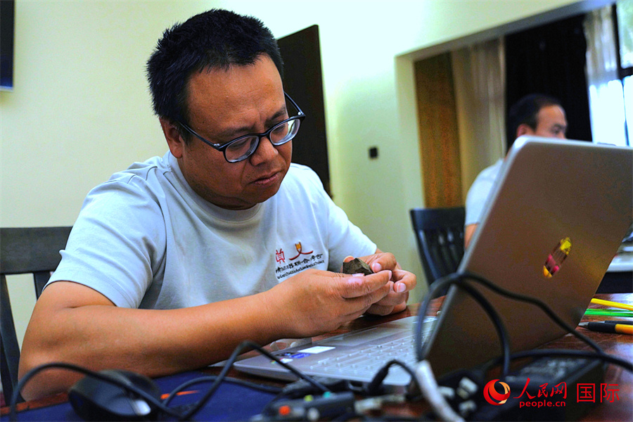 中方隊(duì)員顧雪軍對第10地點(diǎn)出土石制品進(jìn)行分類整理。人民網(wǎng)記者 黃煒鑫攝