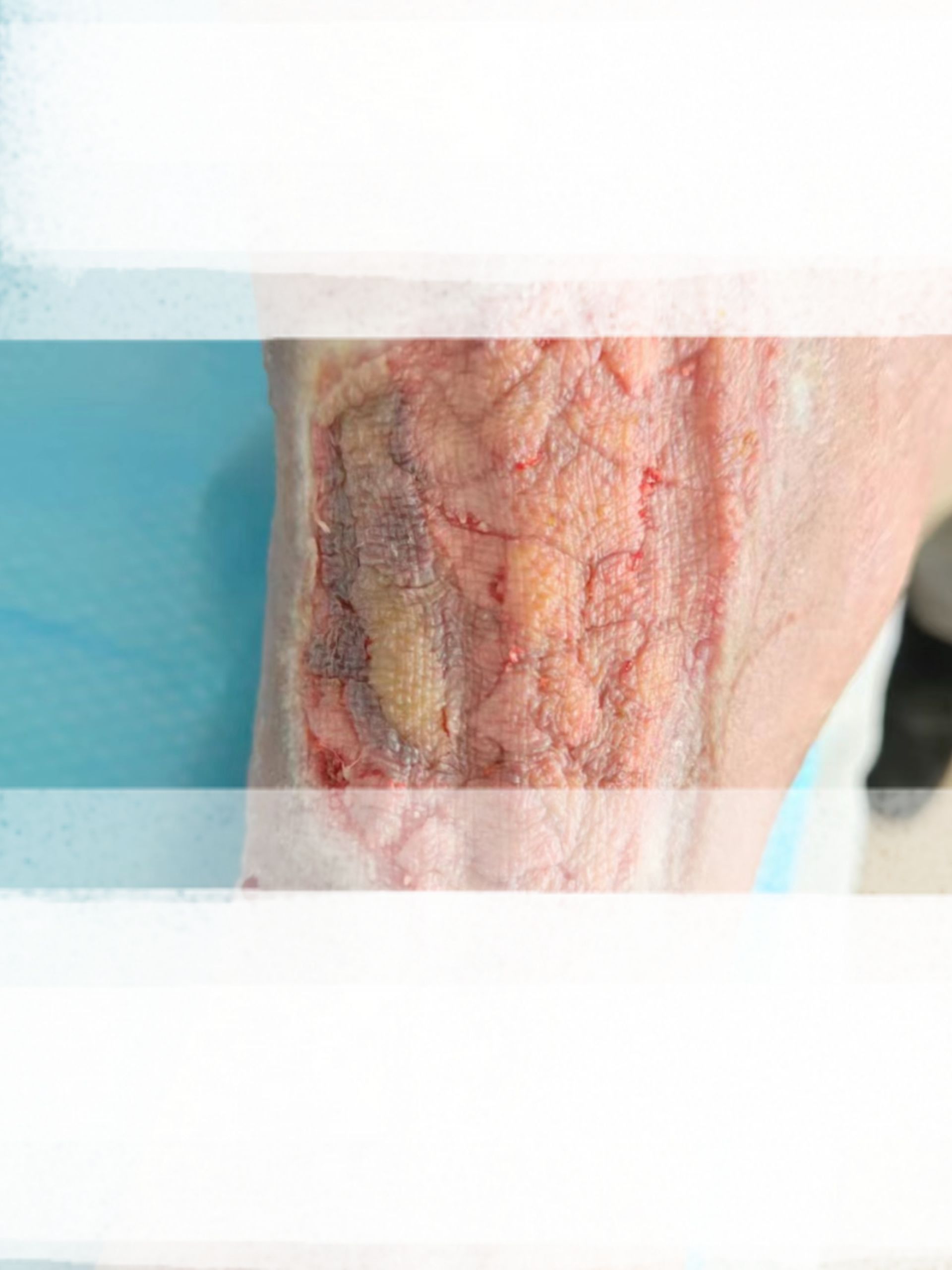 術(shù)中,團(tuán)隊(duì)從老人左大腿取適量韌厚皮片,根據(jù)創(chuàng)面形態(tài)精準(zhǔn)裁剪后,均勻覆蓋于右小腿缺損處及裸露跟腱表面,術(shù)后再次以VSD裝置封閉固定,確保皮片與創(chuàng)面緊密貼合,保障植皮存活率。
