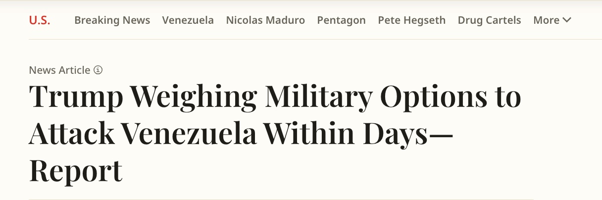 △美國《新聞周刊》報道,特朗普正在權衡于數(shù)日內對委內瑞拉發(fā)起軍事打擊。