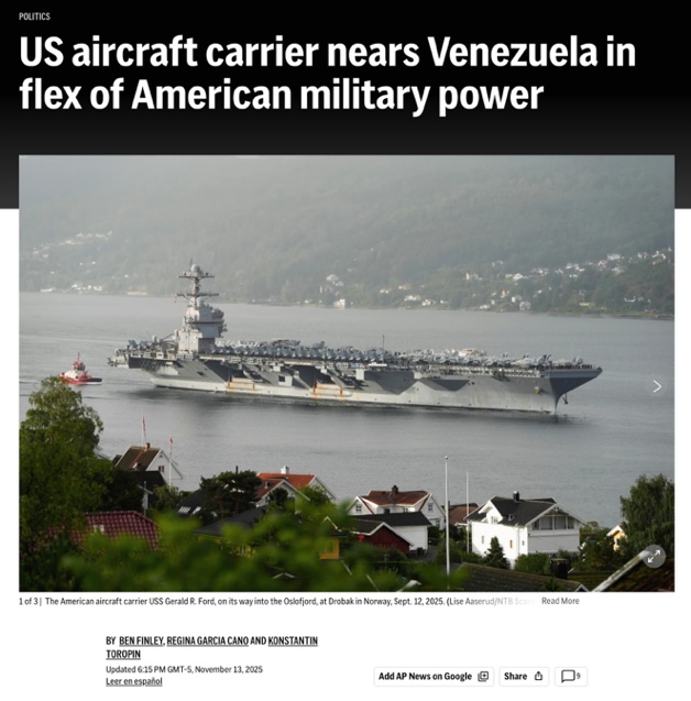 △美聯(lián)社報道,“福特”號航母將在數(shù)日內抵達委內瑞拉近海,美國的這種軍事力量展示,在拉美已有數(shù)代人未曾見過。