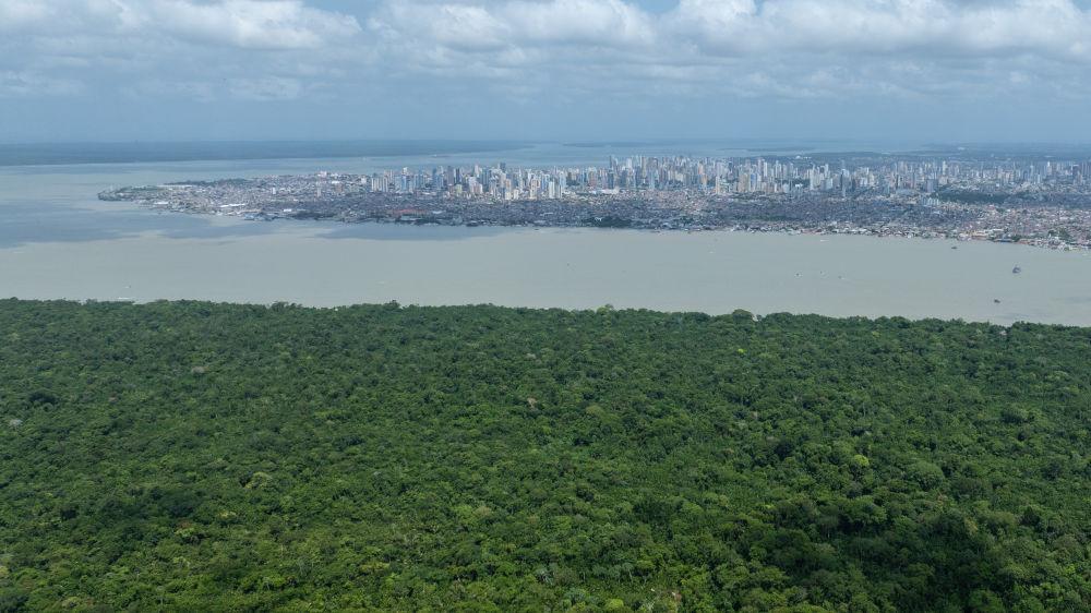 這是11月16日在巴西北部城市貝倫拍攝的熱帶雨林和河道(無人機照片)。新華社記者 王天聰 攝