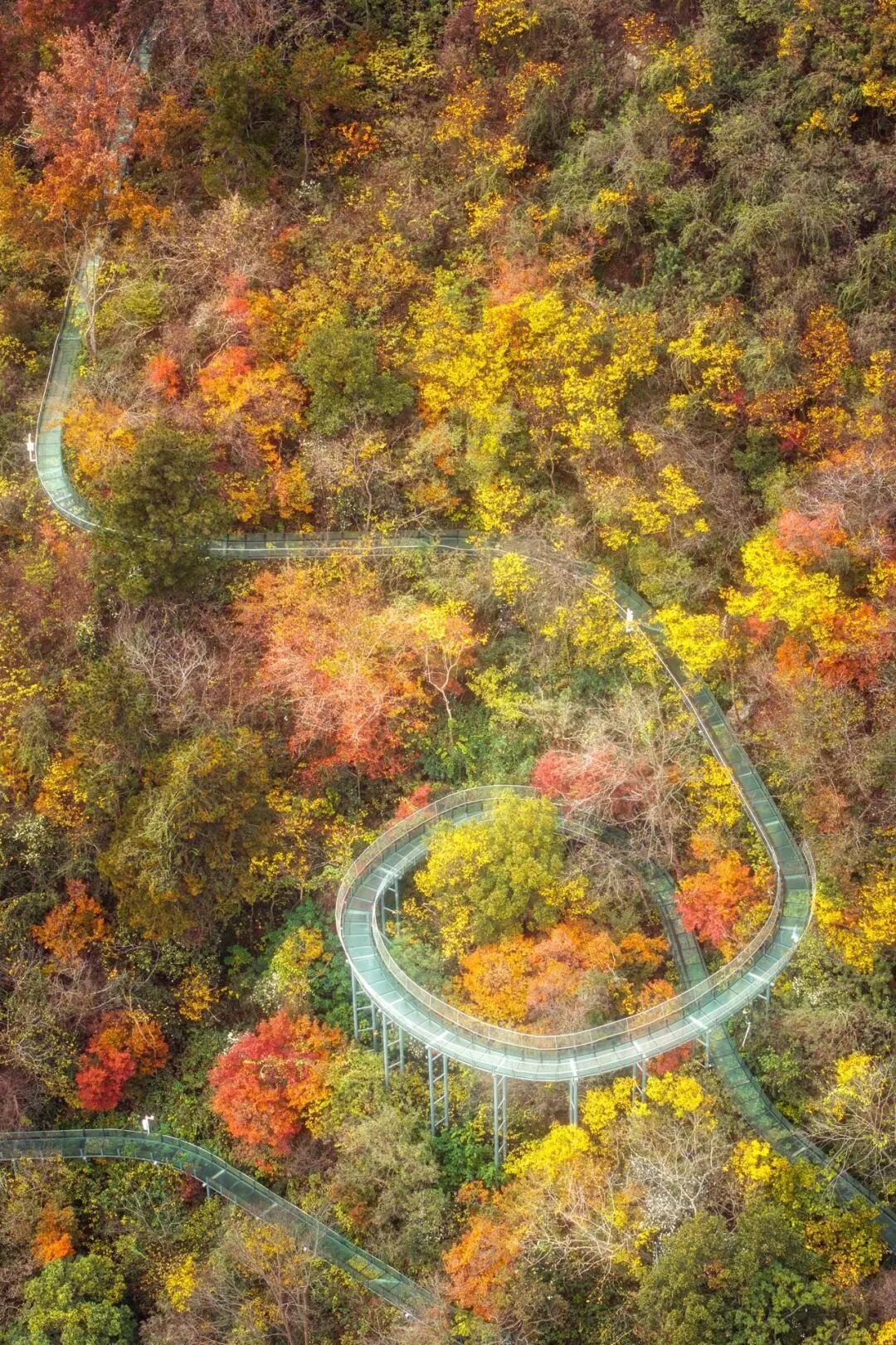 2.站在玻璃天橋俯拍腳下漫山紅葉,捕捉云端漫步的驚險(xiǎn)與美感。