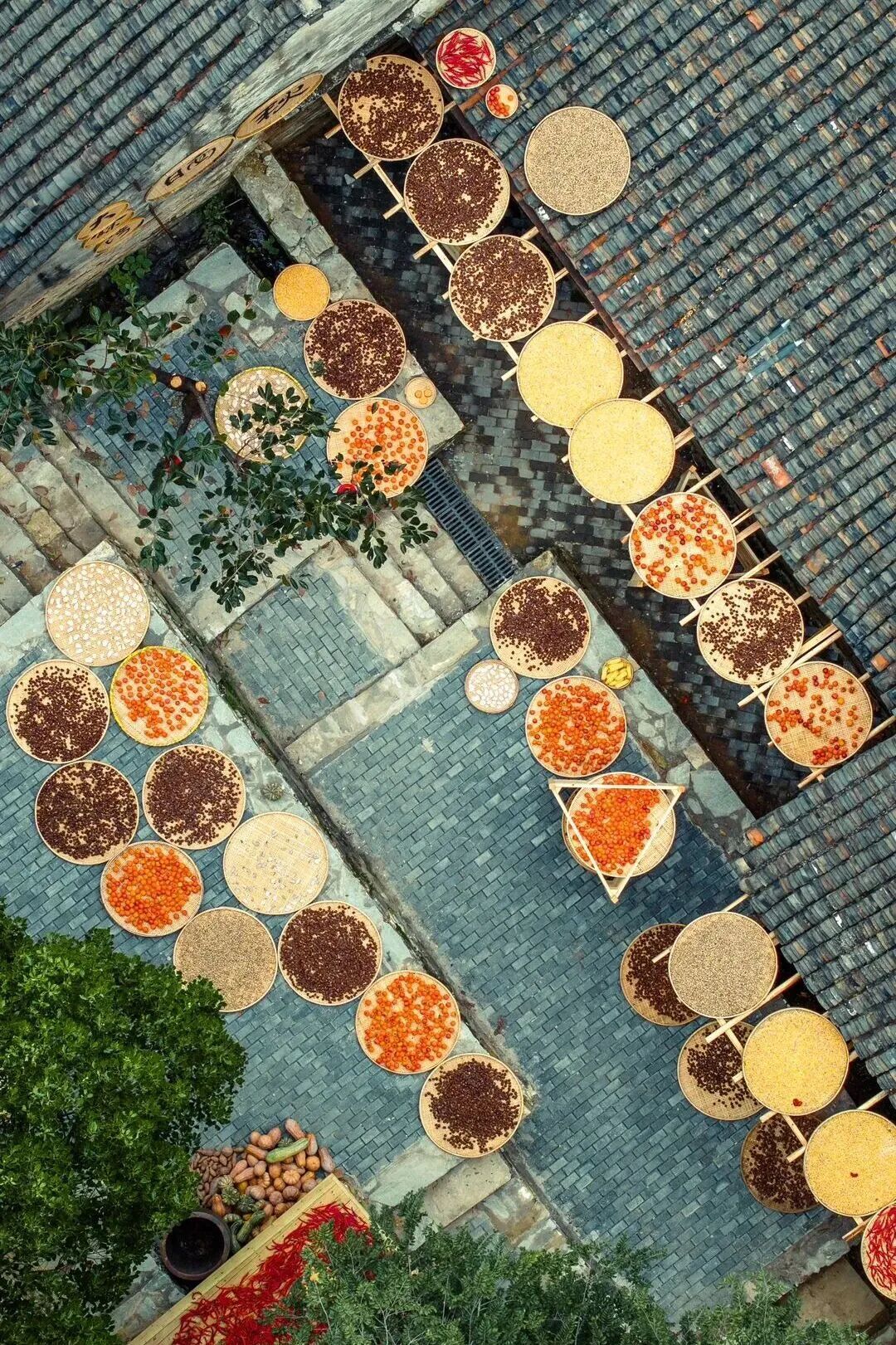 這不是擺設(shè)或表演,是真實(shí)的生活場(chǎng)景。家家戶(hù)戶(hù)門(mén)口擺放的竹匾里,晾曬的是他們一年勞作的收獲。