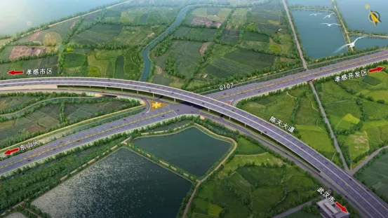 作為孝感融入武漢都市圈的重要基礎設施,陳天大道不僅是關鍵的集疏運通道,更將構建“公路+水運+航空”現代化多式聯運體系,成為推動漢孝兩地深度融合的“新引擎”。項目起于孝武大道與S419相交處,向東延伸,下穿漢孝城際鐵路,上跨G107,最終接市臨空經濟區(qū)已建段,止于界河大橋,全長19.399公里,總投資15.56億元。
