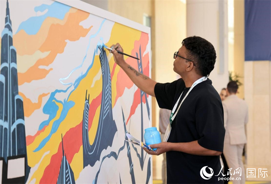一名創(chuàng)作者就迪拜建筑主題作畫(huà)。人民網(wǎng)記者 管克江攝