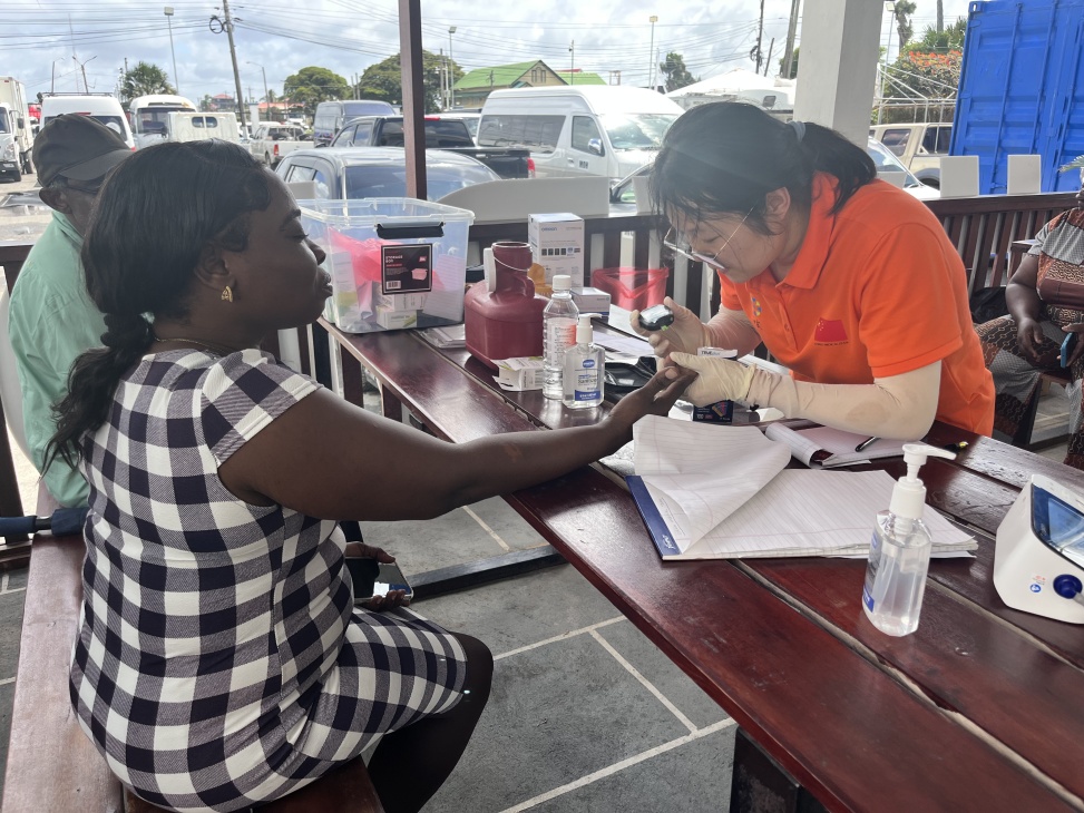 援圭亞那中國醫(yī)療隊(duì)隊(duì)員為當(dāng)?shù)孛癖娺M(jìn)行血糖檢測(cè)。第21批援圭亞那中國醫(yī)療隊(duì)供圖