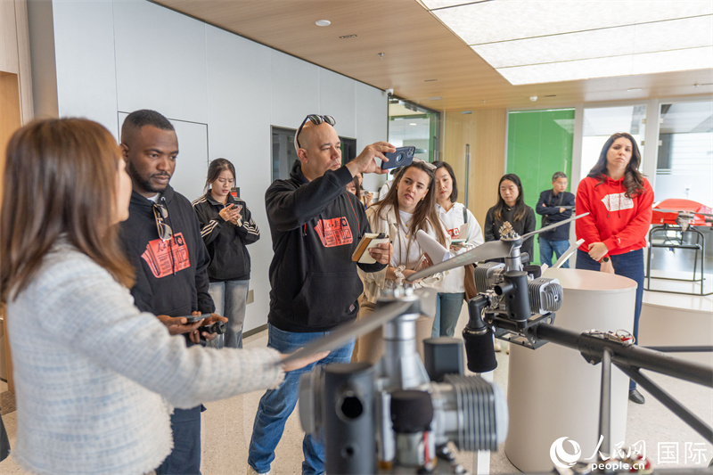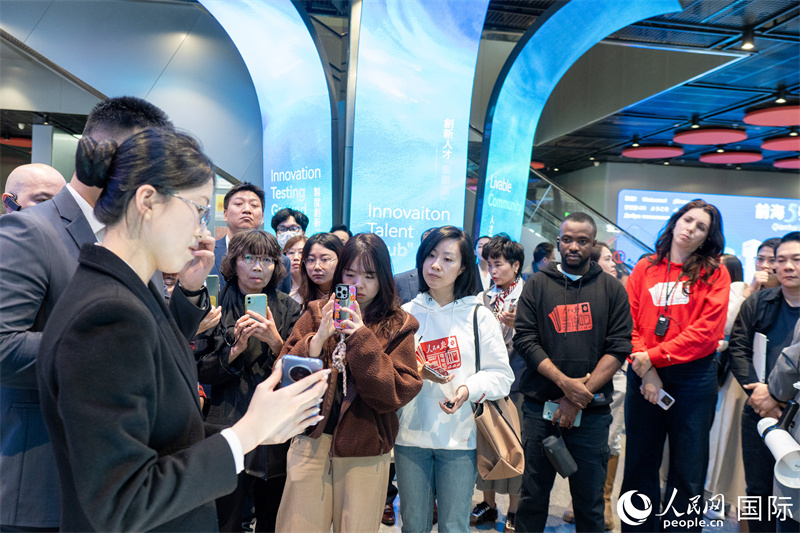 記者團在前海5號樓參觀科技創(chuàng)新產(chǎn)品的展示并聽取講解。人民網(wǎng)記者 許崢攝