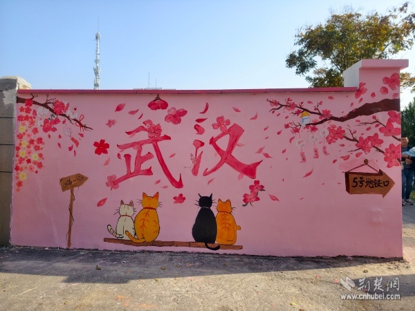 次日,創(chuàng)作進(jìn)入精修階段。志愿者們細(xì)致調(diào)整“武漢”字樣的色彩飽和度,用粉白顏料層層暈染出飛揚的櫻花花瓣。四只形態(tài)各異的貓咪相依蹲坐,靈動可愛;特意添加的“5號地鐵口”指引牌等實用元素,更讓作品兼具藝術(shù)性與功能性。創(chuàng)作過程中,不斷有居民和游客駐足觀賞,主動詢問設(shè)計理念?!拔覀兿胪ㄟ^櫻花、貓咪等元素,展現(xiàn)武漢的浪漫與煙火氣?!敝驹刚咭贿呎{(diào)色一邊向圍觀群眾講解。