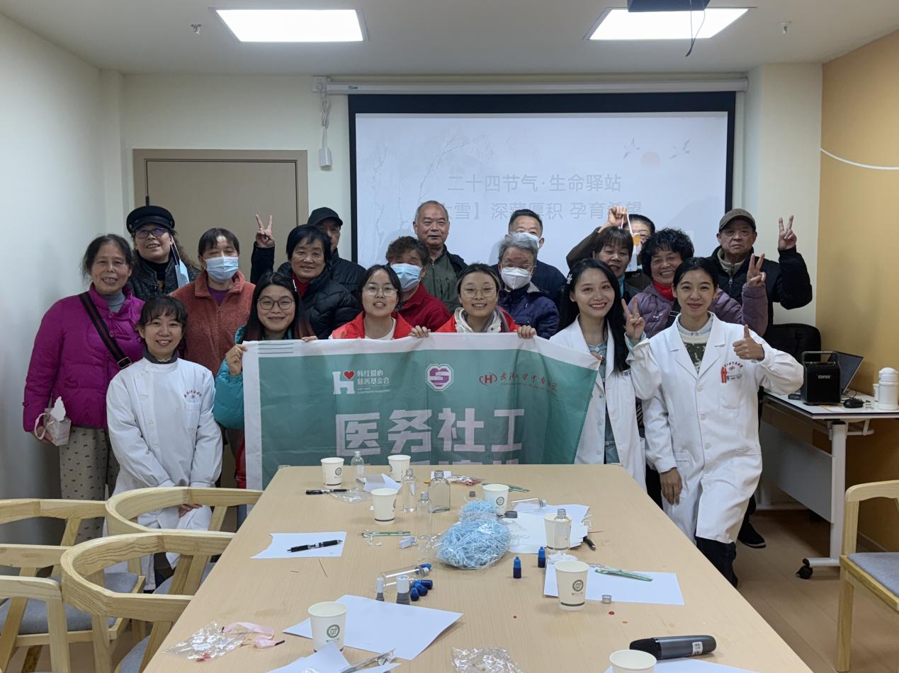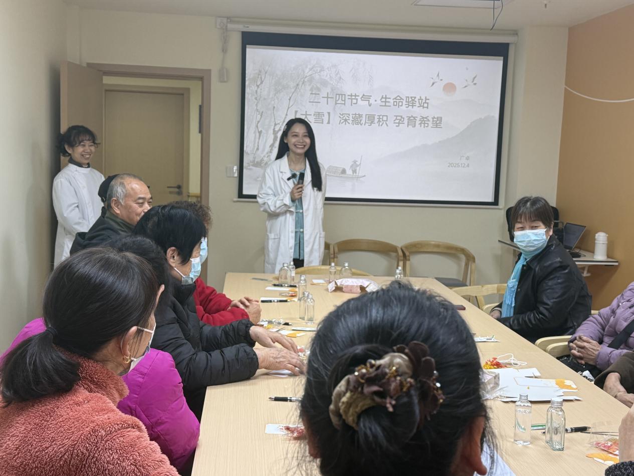 12月4日下午,武漢市洪山區(qū)梨園街道綜合養(yǎng)老服務(wù)中心內(nèi)暖意融融、靜穆有序,“大雪?深藏厚積,孕育希望”二十四節(jié)氣心理團(tuán)輔活動在此溫情開展。本次活動由武漢大學(xué)中南醫(yī)院血液內(nèi)科聯(lián)合東湖社區(qū)衛(wèi)生服務(wù)站、梨園街道綜合養(yǎng)老服務(wù)中心、家庭健康服務(wù)中心共同舉辦,并獲韓紅基金會贊助。以“大雪”節(jié)氣為文化紐帶,深度融合傳統(tǒng)智慧與現(xiàn)代心理關(guān)懷,旨在為轄區(qū)老年人提供一場溫暖而深入的心理團(tuán)輔。