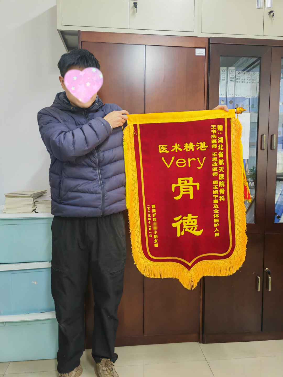 后來,一面特別的錦旗送到了湖北航天醫(yī)院骨科。紅絲絨的旗面上,巧妙繡著“Very 骨德”四個(gè)字。年輕的父親笑著說:“諧音‘very good’。孩子在這里出生,也在這里被治愈,我們放心,更感激?!?/p>