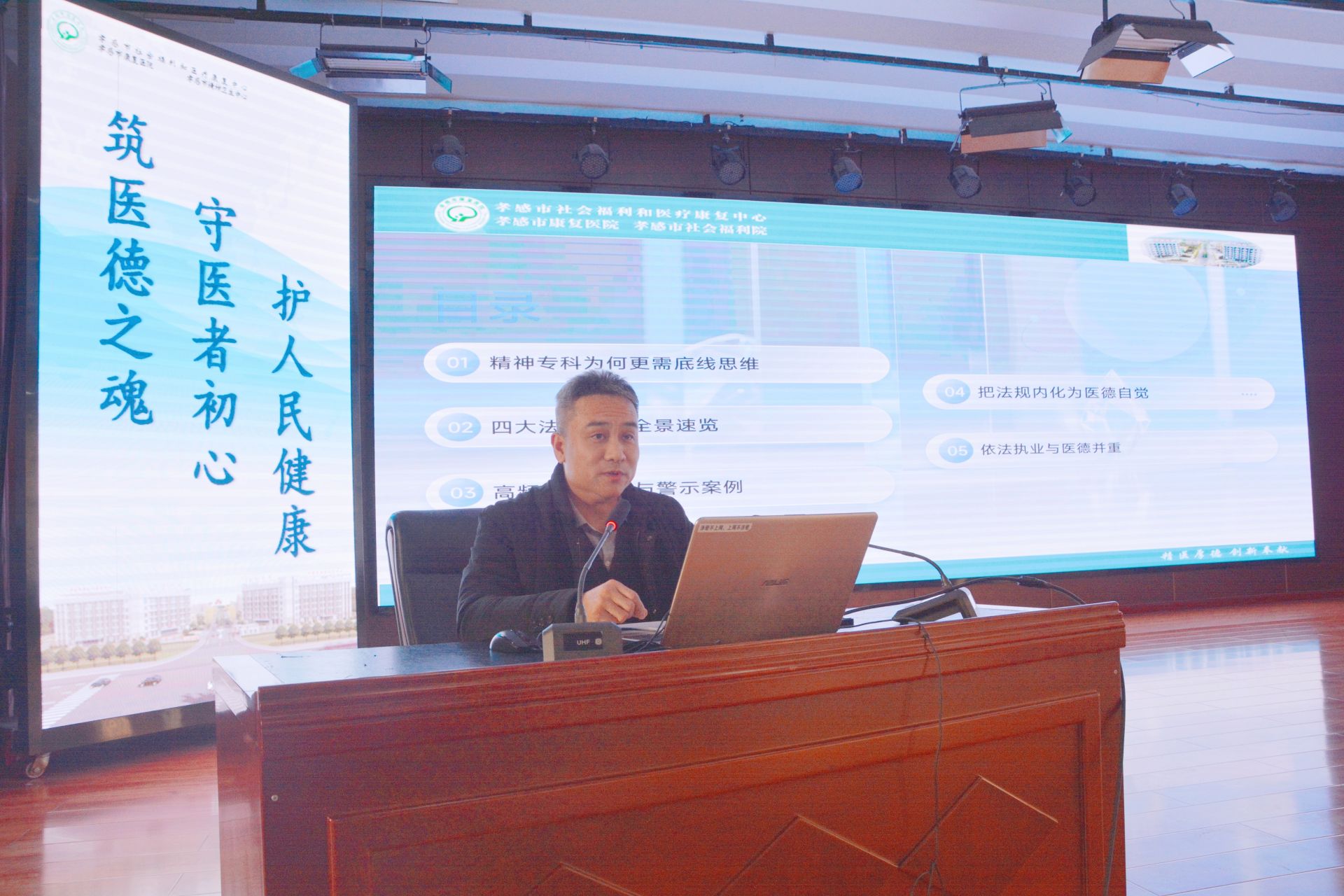 “中心”副主任蘭博以《精神衛(wèi)生領域的法律紅線與職業(yè)底線》為題進行專題講解。他以《精神衛(wèi)生法》等法律法規(guī)為切入口,深入剖析了精神科診療、患者權益保障、醫(yī)療安全等方面易觸及的法律風險和倫理挑戰(zhàn)。通過真實案例解析,清晰劃定了職業(yè)行為的法律邊界與道德底線,引導干部職工強化法治思維、樹立敬畏之心,在恪守專業(yè)準則、規(guī)范執(zhí)業(yè)行為的基礎上,妥善應對復雜診療情境,既切實維護患者合法權益,也有效保障自身執(zhí)業(yè)安全。