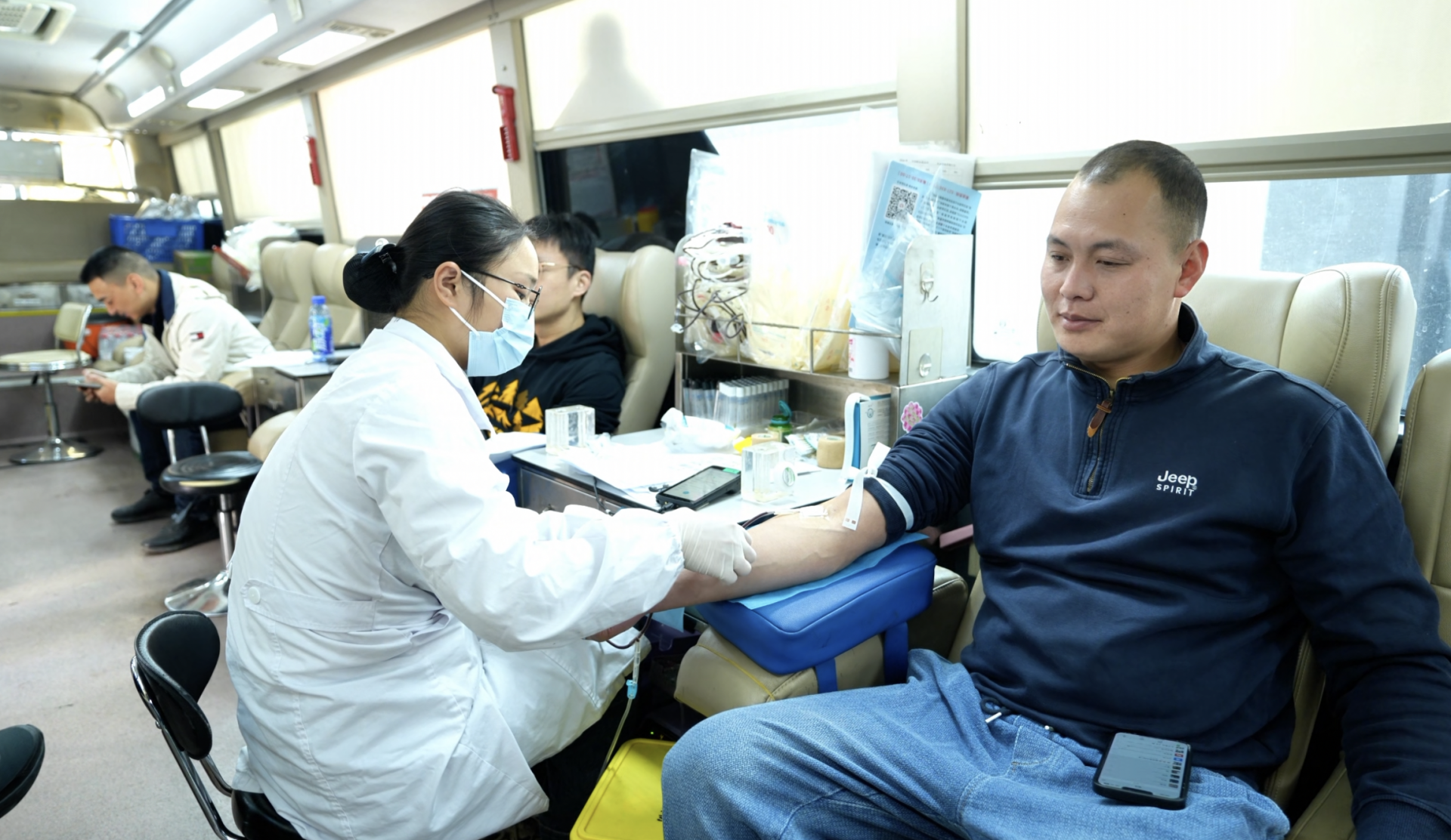 圖為:通過體檢的獻(xiàn)血者在采血車上獻(xiàn)血。