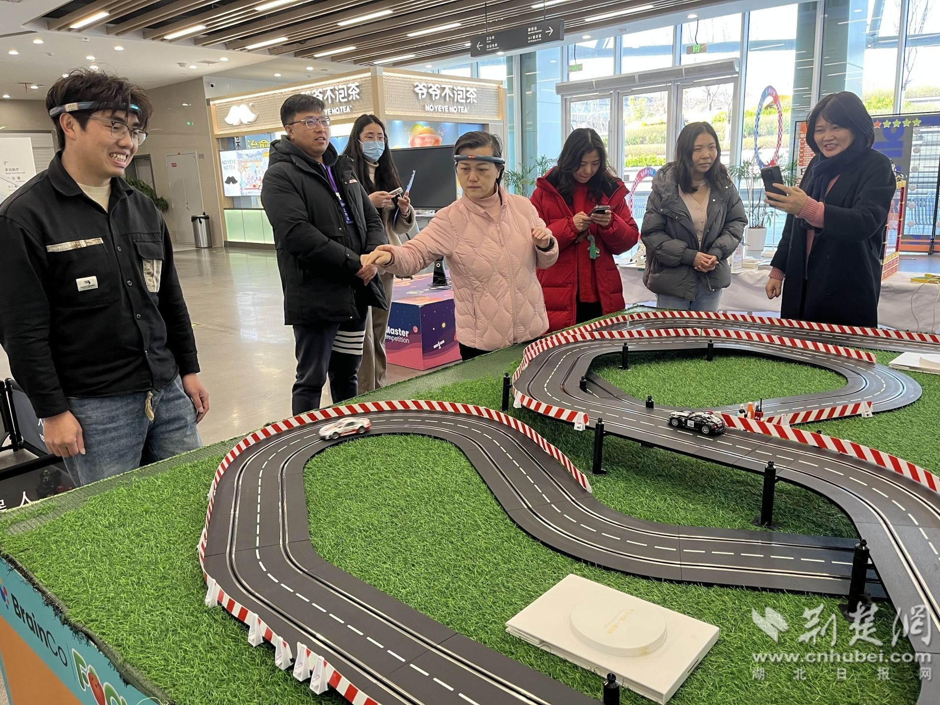 在工作人員的引導(dǎo)下,大家依次體驗了多項科技互動項目。在智控機(jī)器狗展示區(qū),黨員們親手操作機(jī)器狗,近距離感受其靈活動作與智能響應(yīng)能力;腦控賽車體驗區(qū),大家?guī)夏X機(jī)智能頭環(huán),集中精神推動小車前進(jìn),感受“意念控制”的科技魅力;VR重走長征路體驗中,黨員們佩戴設(shè)備后“置身”長征途中,沉浸式體驗革命先輩的奮斗歷程。