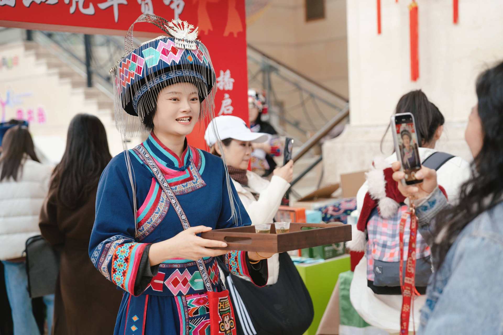 活動尚未正式開幕,極具穿透力的土家歌曲便已“先聲奪人”。身著刺繡銀飾、五彩盛裝的土家阿妹,以原生態(tài)清甜的嗓音裹挾著武陵山區(qū)的清風(fēng),瞬間將每一位踏入會場的嘉賓“拽”進(jìn)了千里之外的土家村寨。