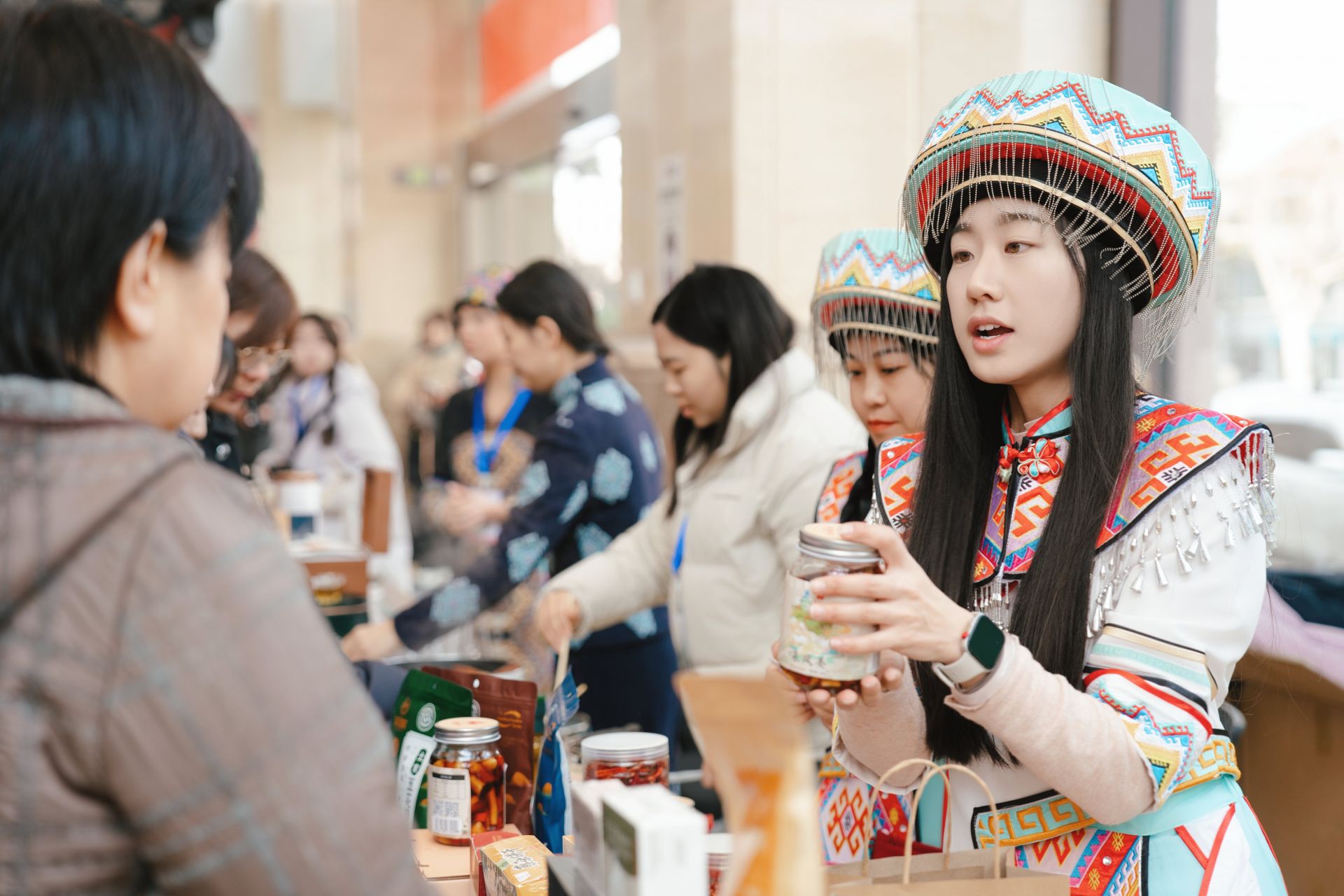“這個香腸嚼著香,再給我裝兩斤!”“臘肉聞著就流口水,正宗土家味!”“有機(jī)山茶油好,既能炒菜又能護(hù)膚,給家里老人帶兩瓶!”贊嘆聲、詢價聲、掃碼支付聲此起彼伏,各個展臺前都排起了小隊(duì)。這些來自武陵山區(qū)的天然物產(chǎn),輔以傳統(tǒng)工藝制作,成為現(xiàn)場最搶手的“香餑餑”。此外,刺繡香包、竹編工藝品等非遺手作也備受青睞。