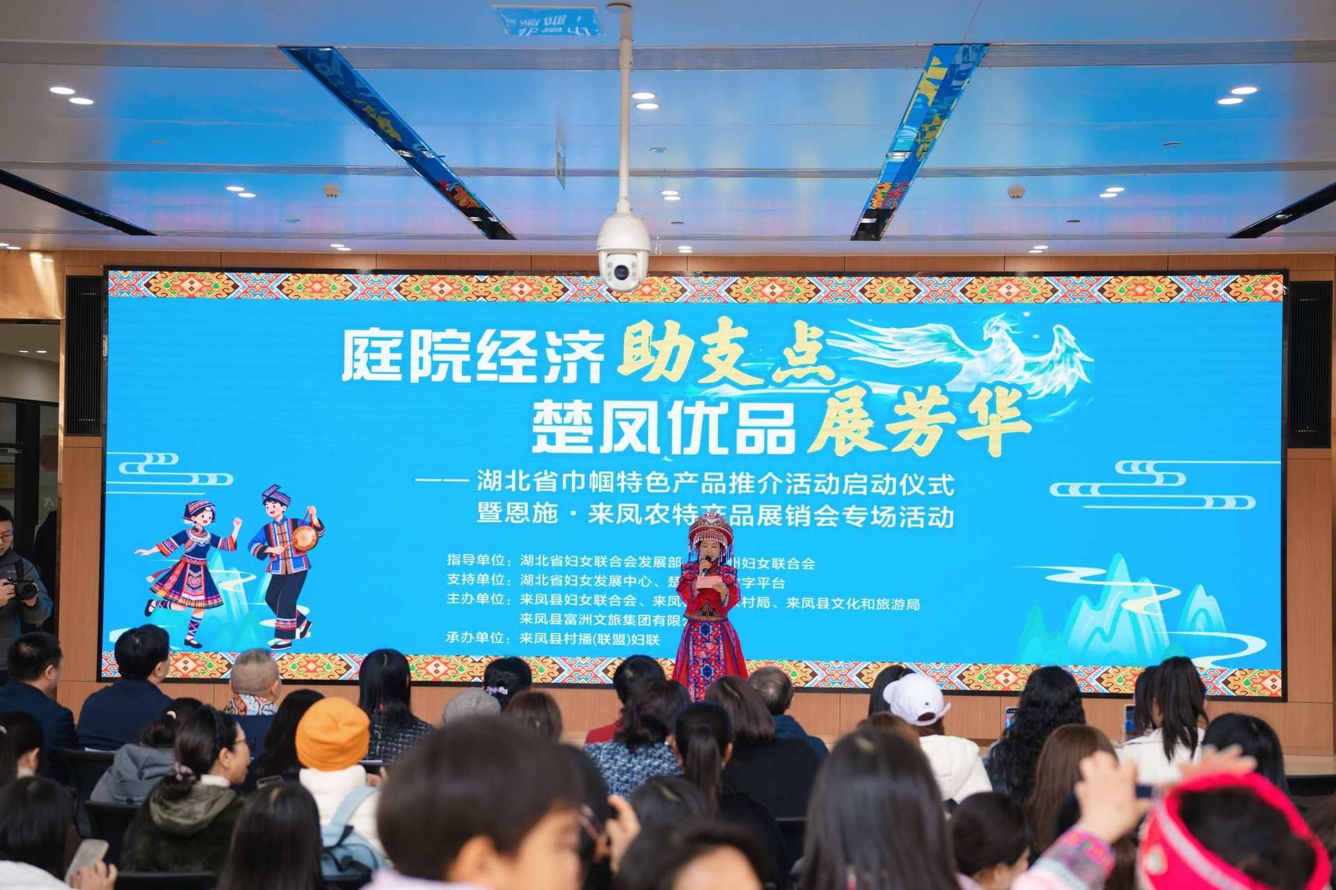 “‘庭院經(jīng)濟(jì)助支點(diǎn) 楚鳳優(yōu)品展芳華’湖北省巾幗特色產(chǎn)品推介活動啟動!”隨著省婦聯(lián)領(lǐng)導(dǎo)的話音落下,歡快的擺手舞旋律響徹全場。現(xiàn)場觀眾與舞者攜手共舞,感受土家族“以舞會友”的獨(dú)特待客之道。