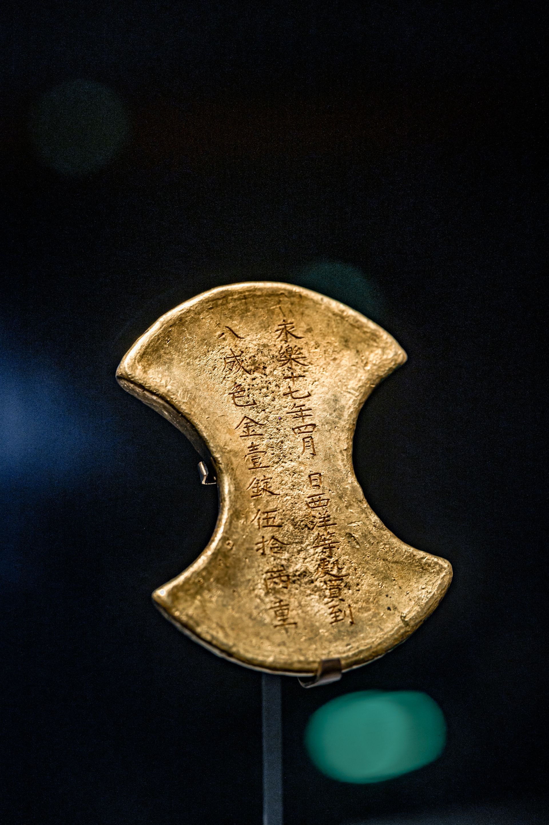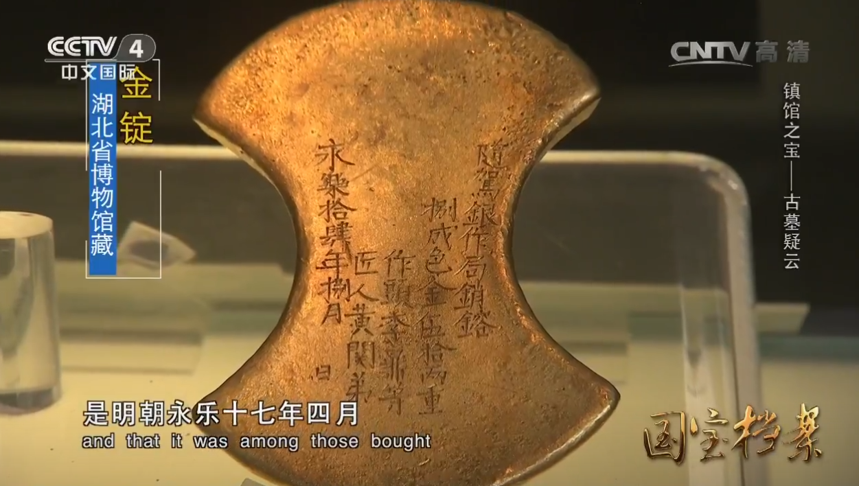 這件備受關(guān)注的金錠,出土于湖北省鐘祥明代梁莊王墓。其正面清晰鑄有“永樂十七年四月 日西洋等處買到/八成色金壹錠伍拾兩重”銘文。