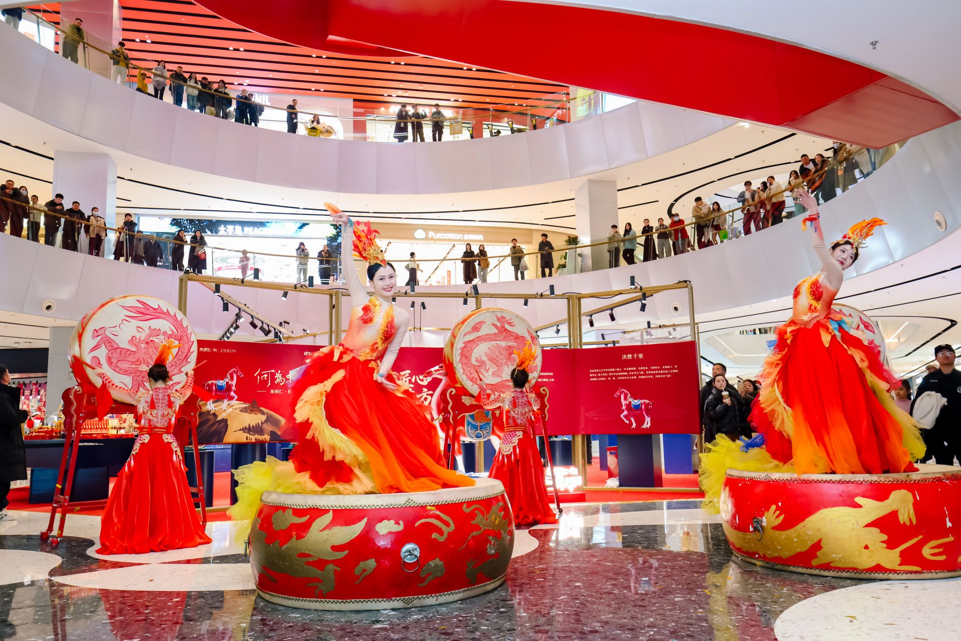 文化賦能讓消費(fèi)更具溫度。戶外500平方米祥云燈籠矩陣融入楚文化鳳鳥紋、瑞獸紋元素,搭配巨型燈籠裝置成為跨年標(biāo)志性打卡地;室內(nèi)“朱炳仁?銅”新春馬年武漢首展展出《燃燒的向日葵》等精品,開放銅板拓印體驗(yàn)??缒暌?,20米超長冷煙火、外立面激光倒計(jì)時(shí)與楚地特色表演同步上演,千份盒馬餃子免費(fèi)派送,“新年照相館”定格溫馨年味,讓市民在濃厚氛圍中迎接2026年。