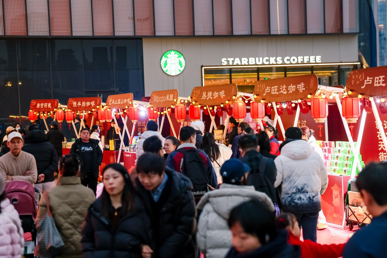 國際廟會(huì)作為核心亮點(diǎn),匯聚數(shù)十家特色商戶,構(gòu)建微縮“全球風(fēng)味檔案館”。8米巨型跨年蛋糕帶來儀式感打卡體驗(yàn),意大利歐蒂姆起泡酒、盧旺達(dá)咖啡等國際飲品與榮獲IIAC國際金獎(jiǎng)的易捷咖啡拼配豆同臺亮相,精釀啤酒、創(chuàng)意雞尾酒與本土精品咖啡形成復(fù)合消費(fèi)場景。米婆婆將中式酒釀與西式咖啡創(chuàng)意融合,美團(tuán)歪馬送酒帶來本土化改良的熱紅酒文化,展現(xiàn)全球潮流與本土創(chuàng)新的深度碰撞。