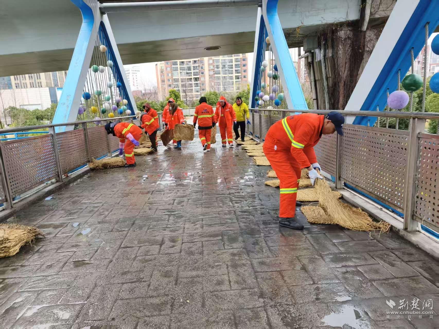 防滑措施同樣向行人集中區(qū)域延伸。19日17時起,吳家山環(huán)山路人行天橋上,環(huán)衛(wèi)工人與執(zhí)法隊員開始鋪設(shè)防滑草墊。“橋兩側(cè)是學(xué)校,晚高峰和早高峰人流集中,提前鋪設(shè)能減少滑倒風(fēng)險?!眳羌疑浇志C合執(zhí)法中心副主任陳偉說。