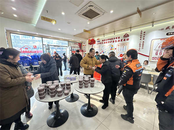 活動現(xiàn)場,“暖心聯(lián)盟”企業(yè)劉胖子家常菜館中央花園店開展“暖心臘八粥 暖胃更暖心”服務(wù),提供百余份臘八粥。工作人員將臘八粥分裝至便攜餐盒,搭配一次性餐具,供戶外工作者排隊(duì)領(lǐng)取,方便其攜帶食用。外賣小哥夏博文表示,驛站每逢節(jié)日都會組織關(guān)懷活動,剛開完晨會就能吃上熱粥,切實(shí)感受到“娘家人”的關(guān)懷,渾身充滿干勁。