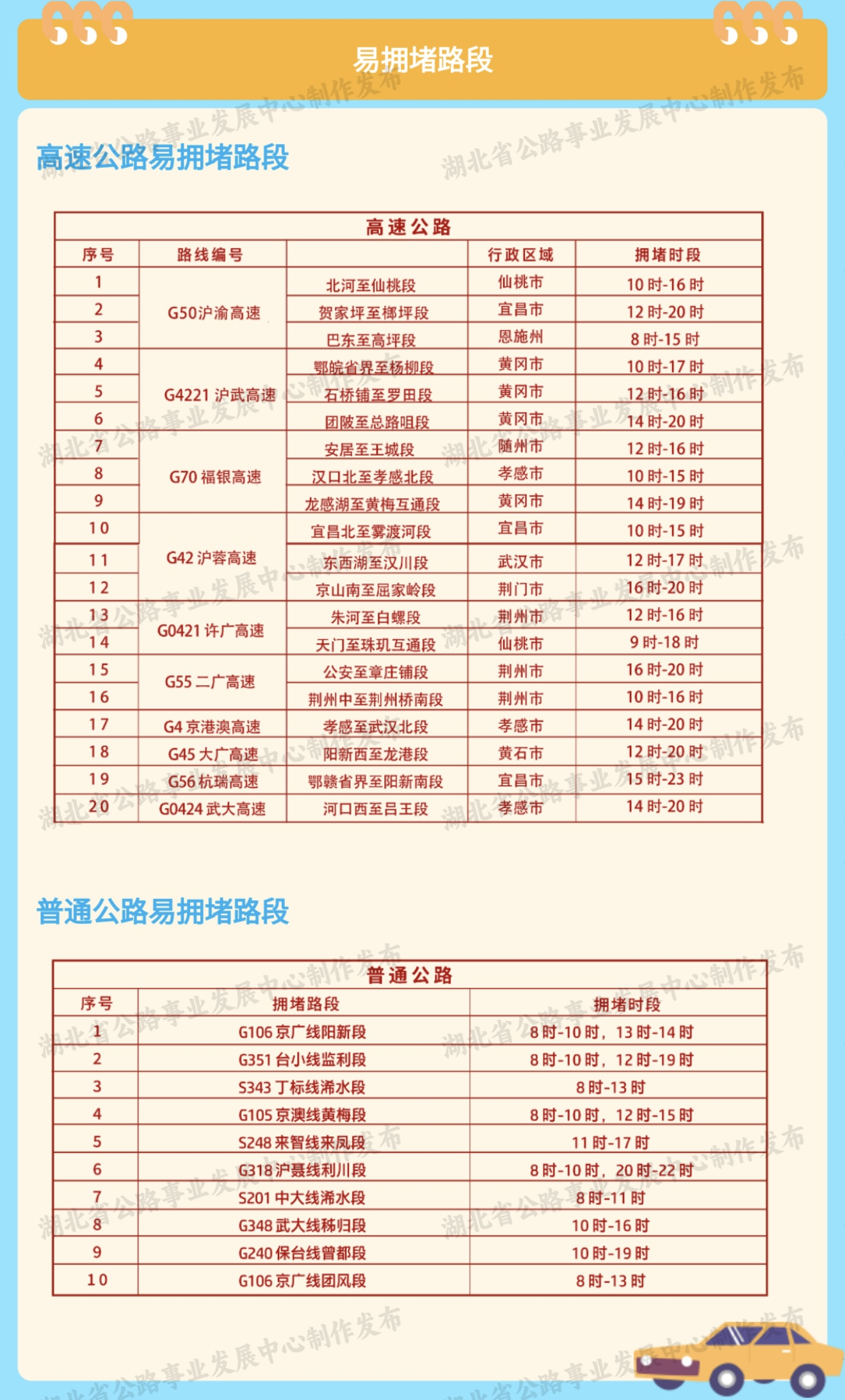 5.遇交通事故或車輛故障時,要牢記“9字警句”:車靠邊、人撤離、即報警。普通公路行車時車輛發(fā)生交通事故請撥打122;高速公路行車時車輛發(fā)生交通事故請撥打(027) 96122,需要清障救援請撥打(027) 12122。