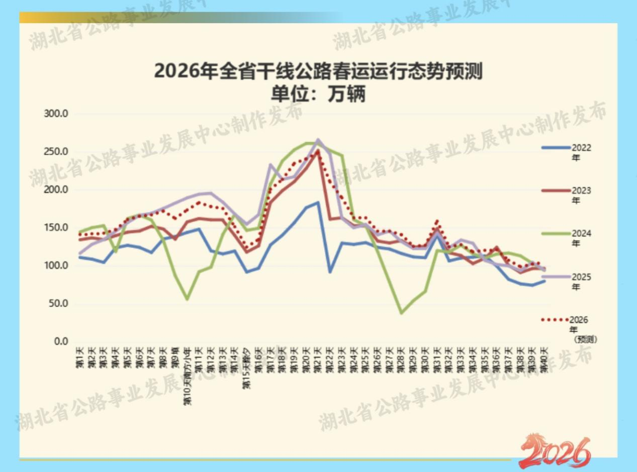 預(yù)判2026年春運期間普通國省干線公路日均斷面交通當(dāng)量,與2024年春運期間、2025年春運期間基本持平。