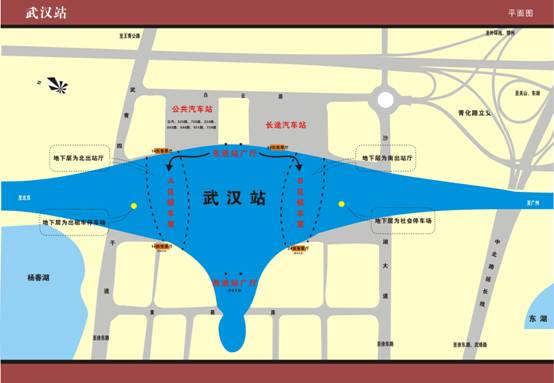 武漢站的設計采用四層的立體結構。最上面一層為候車區(qū)和售票區(qū),下面一層為乘車區(qū),檢票后,旅客可以乘電梯直接下到動車旁。再下面為地面層,用于旅客出站以及社會車輛停車。最下面一層為地下層,為地鐵準備,目前正在施工中。