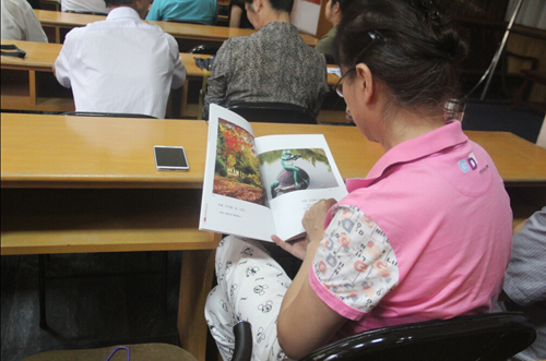 8月2日下午,在經過半天休整之后,方老師開始為團員們講課!拔覀兝夏耆藨撚凶约旱呐d趣和追求,要學會自己找樂!薄艾F(xiàn)在小孩都是老年人在帶,我們學會了攝影就可以教孩子,對他們將來也有好處!狈嚼蠋煹囊幌,頓時就讓許多團員萌生了學攝影的想法。接著,他向團員們展示了自己拍攝的眾多精彩照片,并拿出一本攝影圖集供大家傳閱!斑@本圖集里,都是我在老年大學教書時,學員們拍的照片。最大的學員都80多歲了,但是照片拍的特別好。相信大家通過學習,也可以拍的如此精彩!狈嚼蠋煹脑,給了在座的老人極大的信心,大家也學的更加認真。